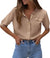 Fit & Style Regular, feminine fit with short sleeves, V neckline, and button-front design that can be worn as a blouse or lightweight cardigan.