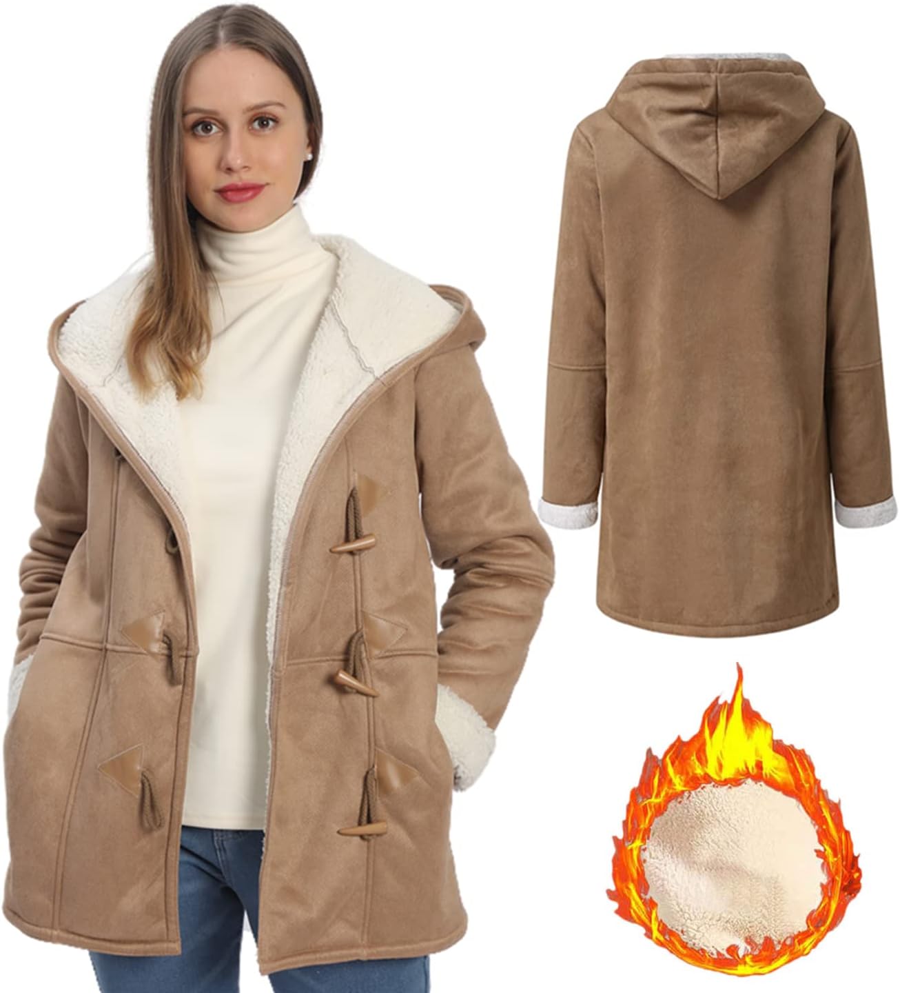 Features Sherpa-lined hood, horn-button front, windproof construction, and two slant hand pockets for warmth and secure storage.