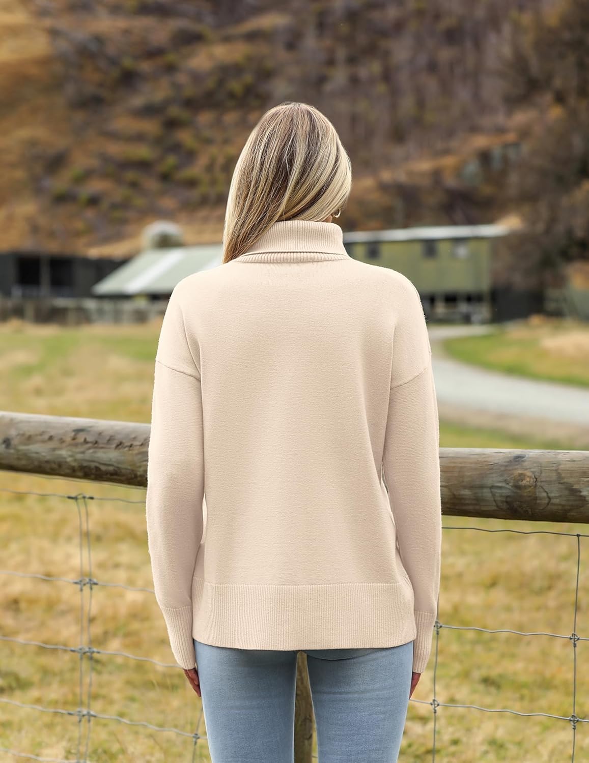 | Fit & Style | Relaxed, slightly oversized pullover with classic turtleneck, drop shoulders, and a flattering high-low, asymmetric hem. |