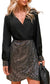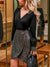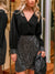 Features Glitter sequin finish, wrap-inspired mini length, pull-on closure, long sleeves, and a refined V-neck that pairs beautifully with coats, heels, and statement jewelry.