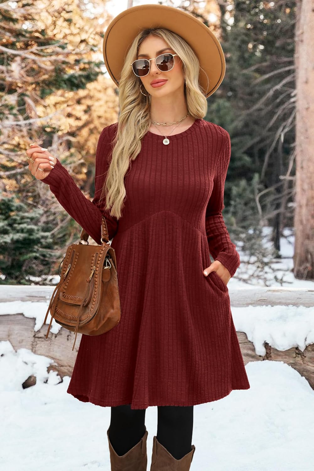 | Features | Empire-waist tunic silhouette, convenient side pockets, long sleeves, and versatile length that pairs well with leggings, jeans, or boots. |