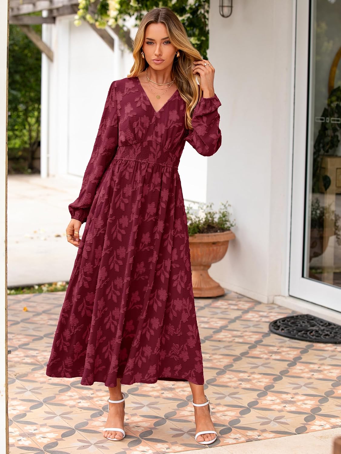 Fit & Style Empire waist A-line maxi silhouette with smocked waist for comfortable definition, V-neckline, long sleeves, and a flowy ankle-length hem that flatters most body types.
