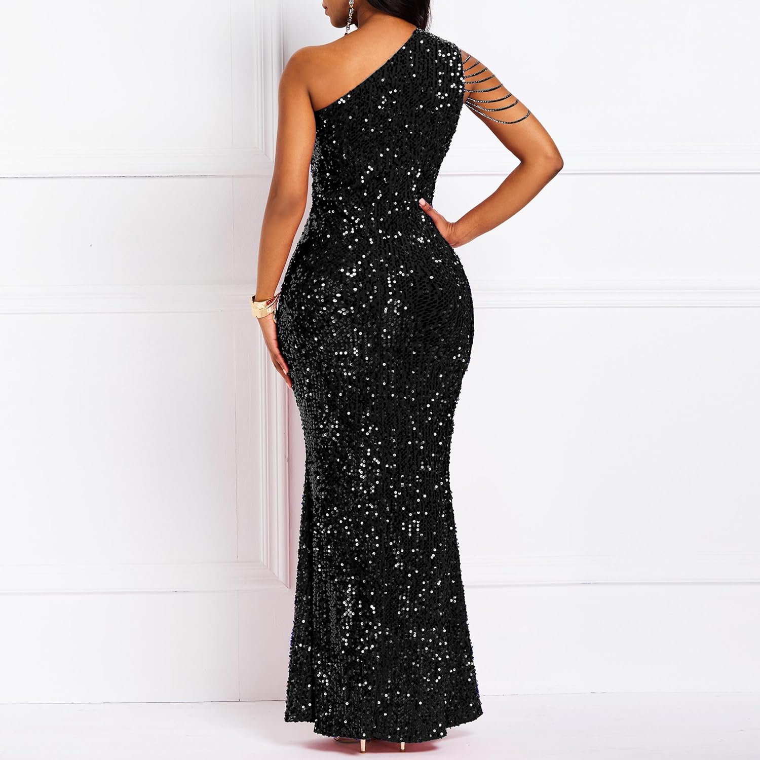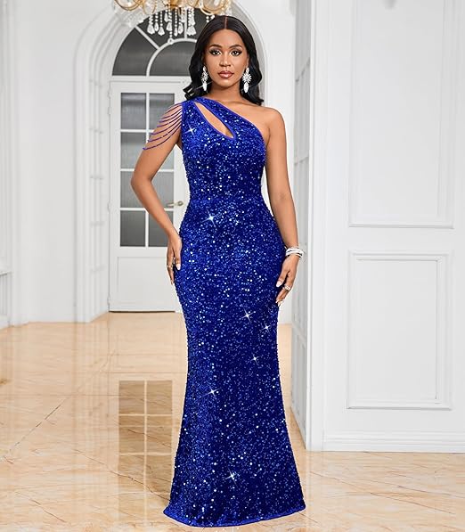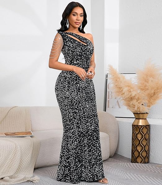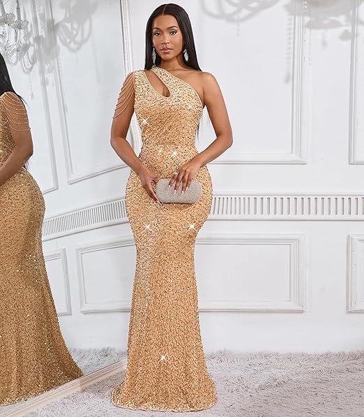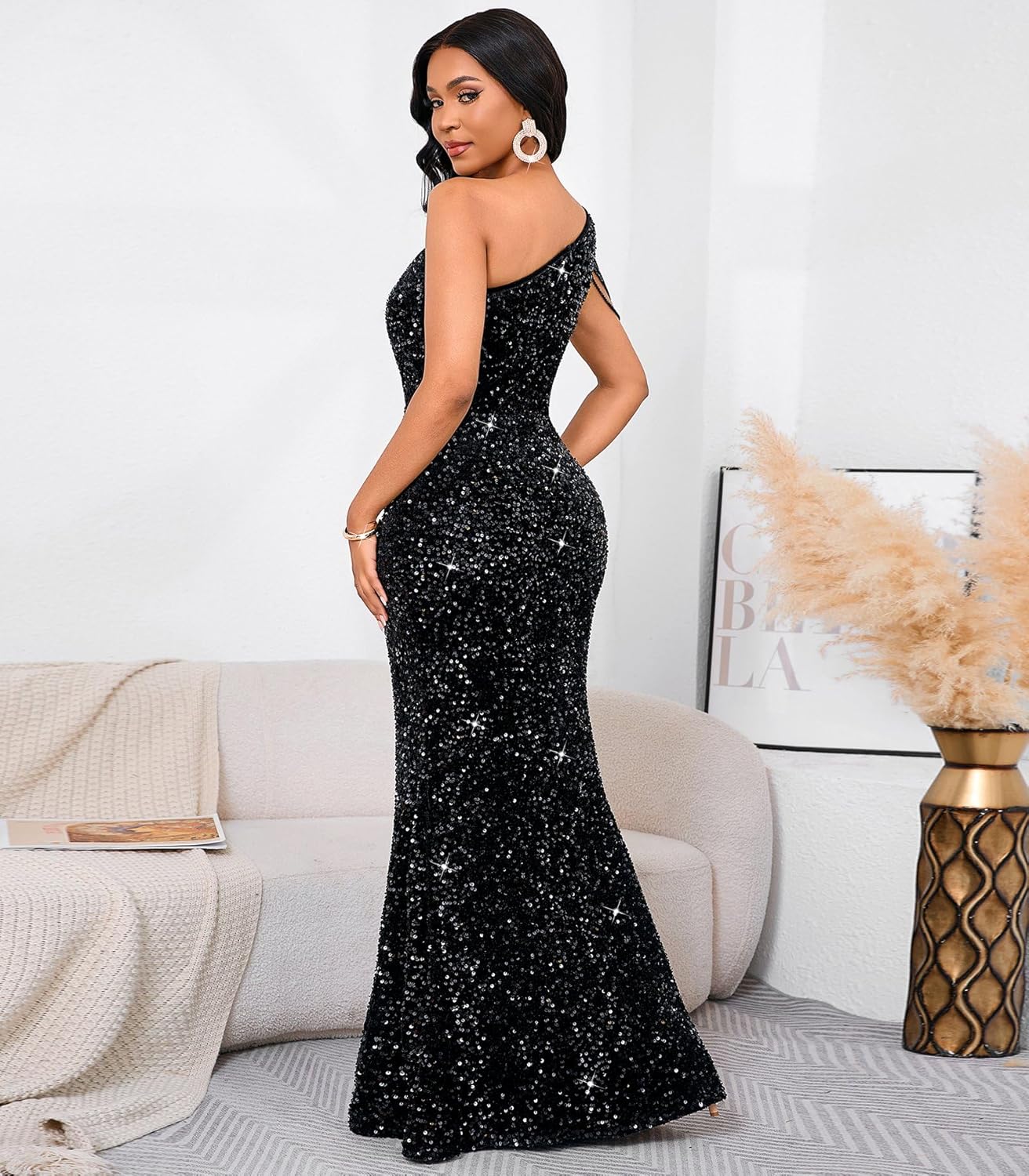 Step into the room with luminous confidence in this shimmering one-shoulder sequin gown, tailored to sculpt and flatter every curve. Elegant tassel and mermaid details create a timeless, feminine silhouette that feels luxurious on the skin, making every special evening feel unforgettable and effortlessly glamorous.