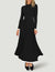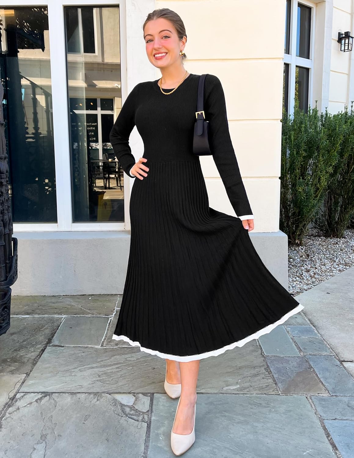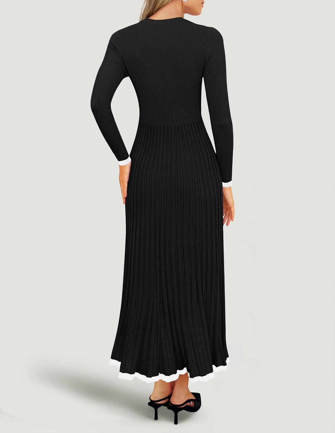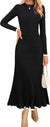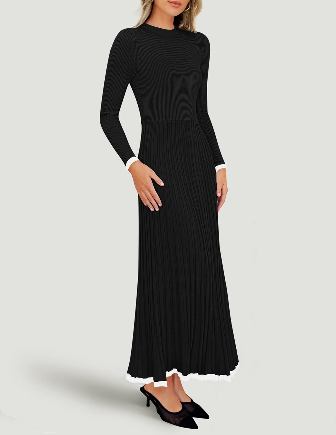 | Fit & Style | Figure-flattering slim bodice with ribbed texture and a pleated A-line midi/long maxi skirt; crew neck and long sleeves create a refined, timeless silhouette. |