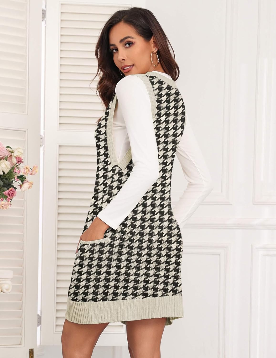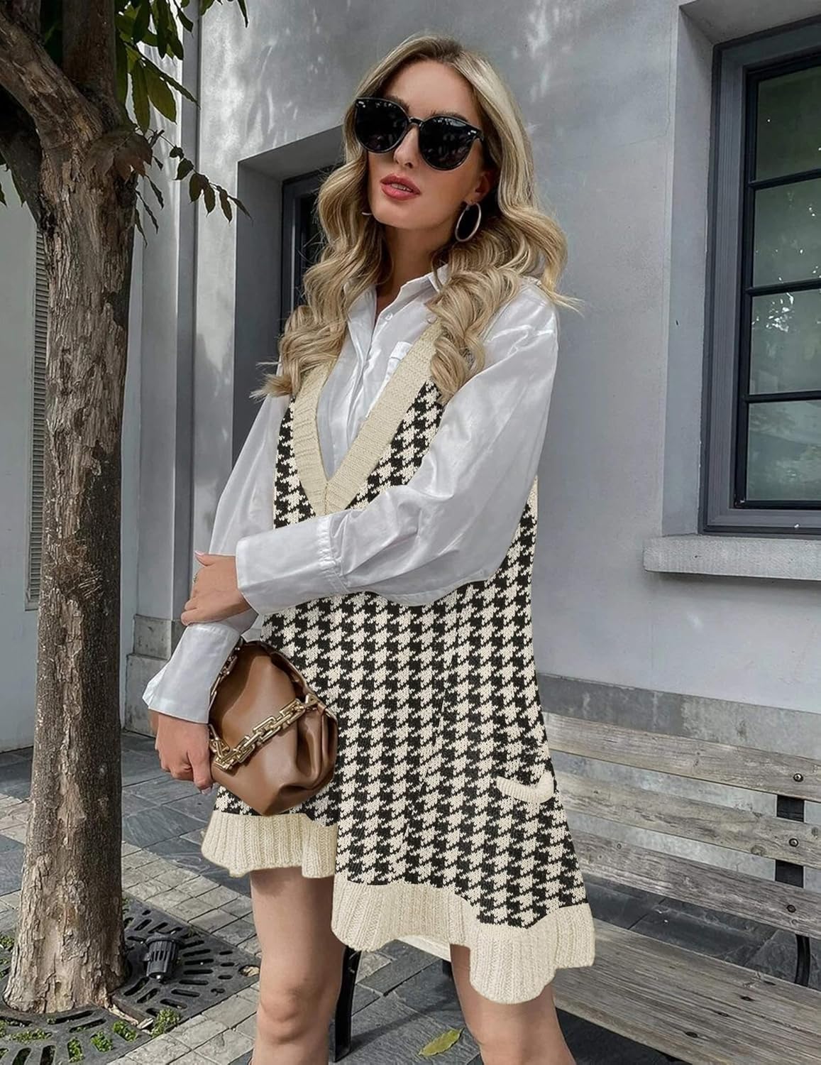 | Fit & Style | Oversized, loose-fit sweater vest dress with deep V-neck, sleeveless cut, and swing A-line hem for easy layering and figure-friendly drape. |