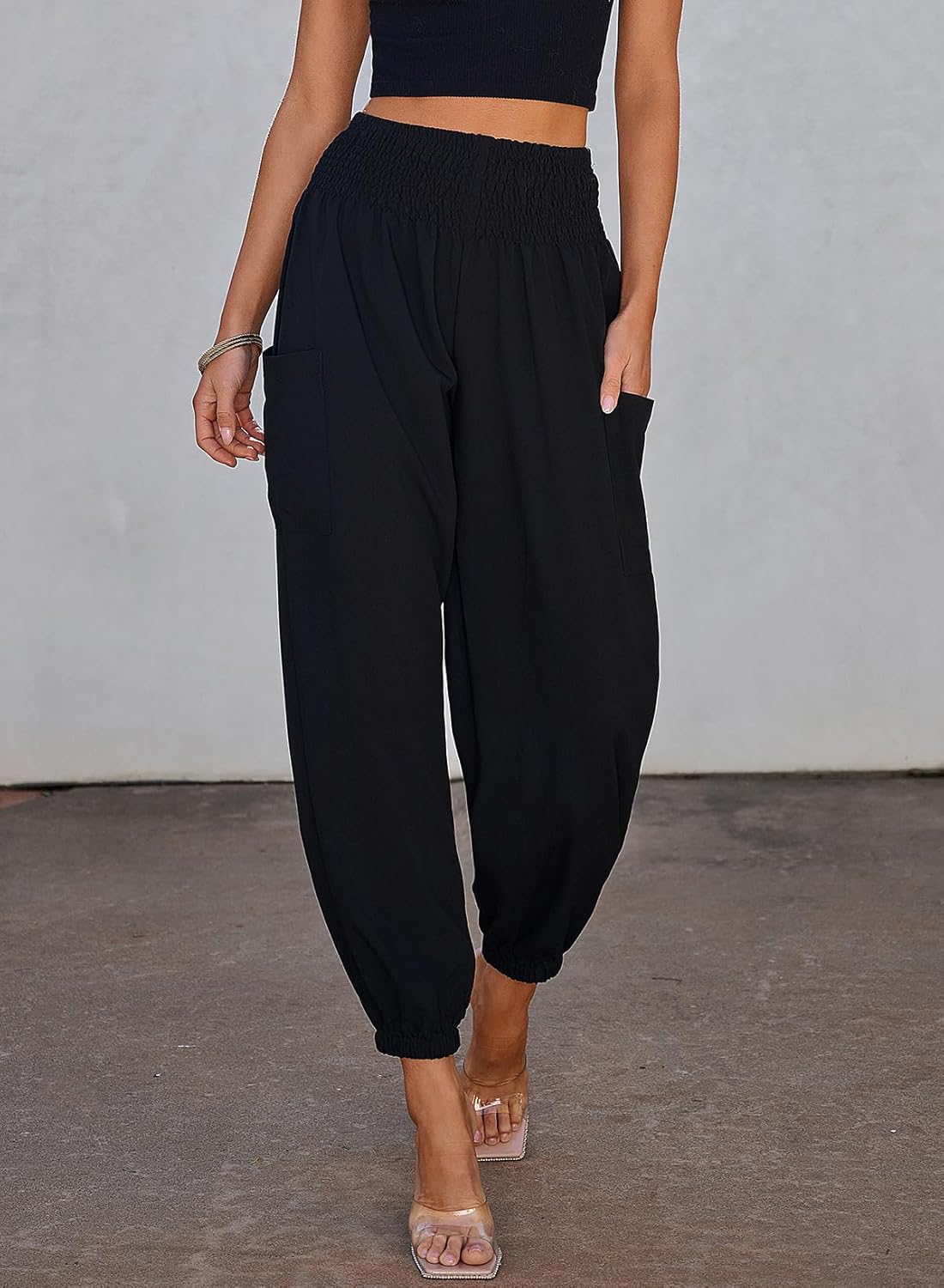 Fit & Style Relaxed, high-rise smocked waist with tapered legs, palazzo-inspired ease, elastic ankle cuffs, and a flowy boho-harem silhouette.