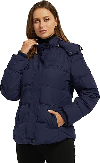 | Fit & Style | Quilted puffer silhouette with a feminine, figure-flattering shape, full front closure, and a removable hood for versatile styling. |